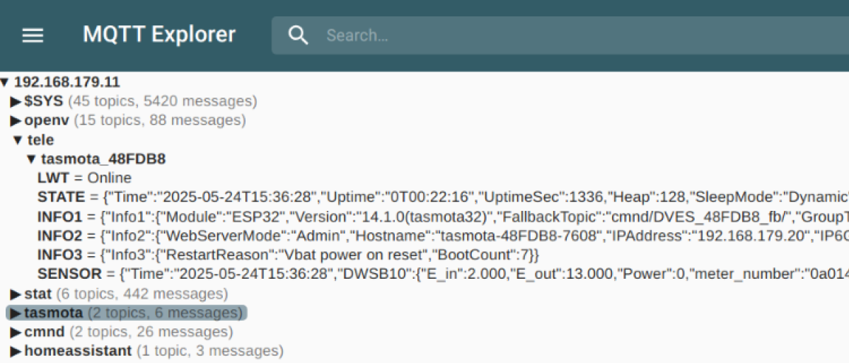 Damit die Daten im Homeassistant ankommen, muss man noch MQTT konfigurieren. Hierzu braucht es einen mosquitto-Server. Mittels MQTT-Explorer lassen sich die übermittelten Daten einsehen, um unter "tele" die erforderlichen Parameter für die configuration.yaml zu finden. MQTT-Explorer